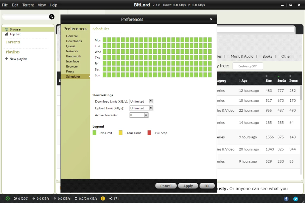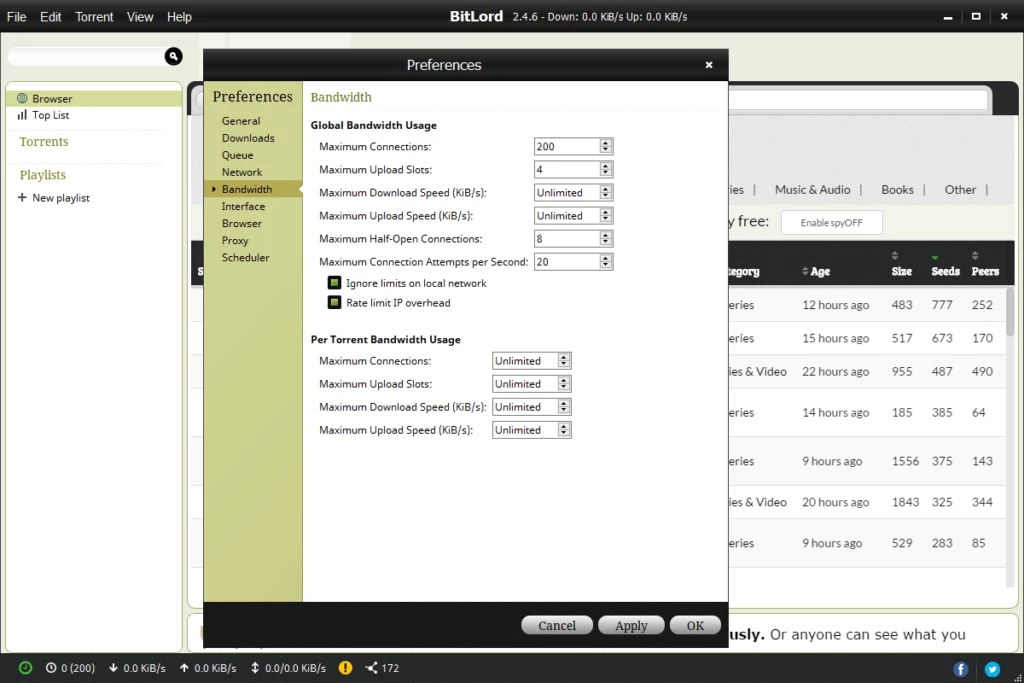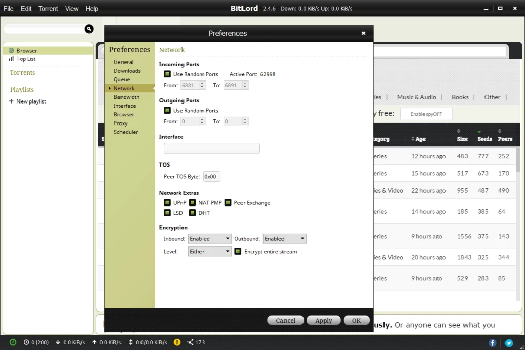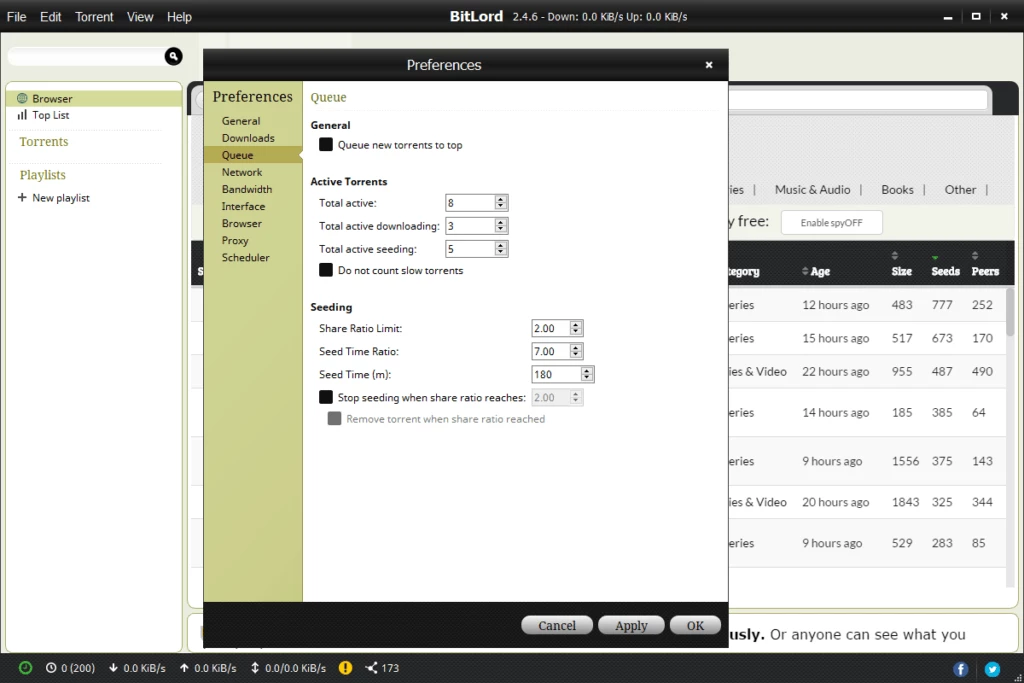 El menú de preferencias del programa permite personalizar su funcionalidad. Resulta muy útil para usuarios experimentados, ya que permite personalizar completamente la configuración para la descarga de torrents.